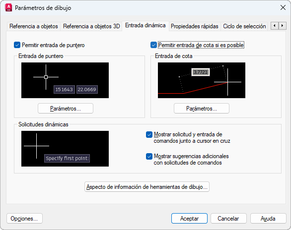 Controla la entrada de puntero, la entrada de cota, las solicitudes dinámicas y el aspecto de la información de herramientas de dibujo.