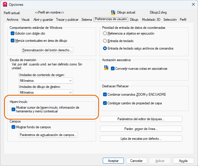 Active la visualización de información de hipervínculo en la ficha Preferencias de usuario del cuadro de diálogo Opciones.