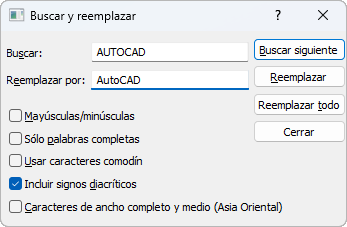 Busca todas las apariciones del texto introducido en Buscar y las reemplaza por el texto introducido en Reemplazar con.
