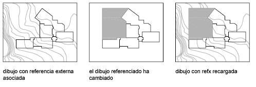 Cuando abre un dibujo, se actualizan automáticamente todas las referencias externas. La opción Recargar de la paleta Referencias externas se utiliza para actualizar las referencias externas cuando desee asegurarse de que se muestren las versiones actuales en el dibujo.