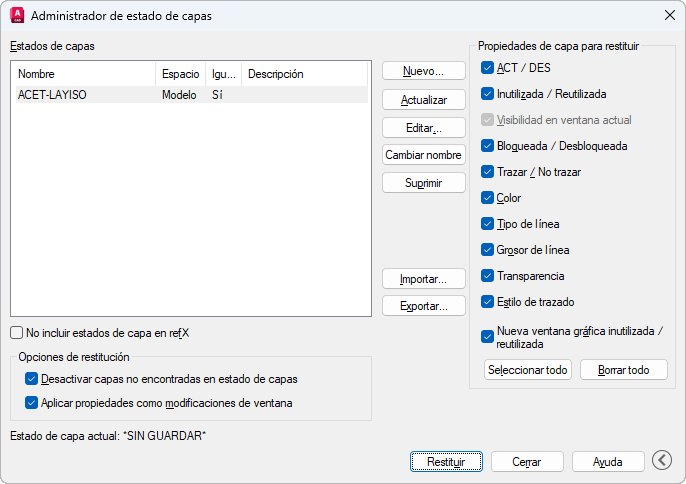 Restituye los parámetros de capa guardados en el estado de capa especificado en función de los parámetros que se encuentren activados en la columna Propiedades de capa para restituir.