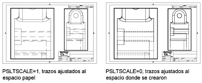 Se pueden aplicar escalas a tipos de línea en espacio papel, ya sea utilizando unidades de dibujo del espacio en que se creó el dibujo o unidades de espacio papel.