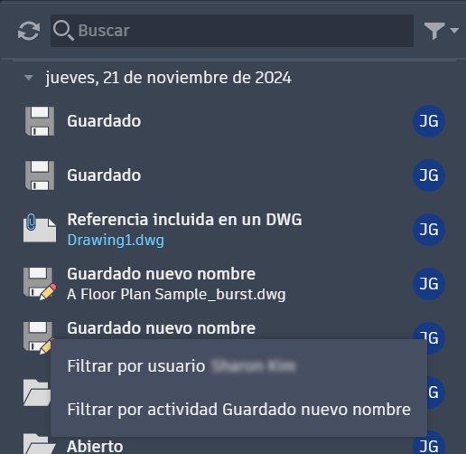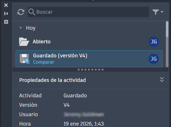 Nota: Actualmente, AutoCAD LT solo muestra la actividad de versión en la paleta Información de actividad.