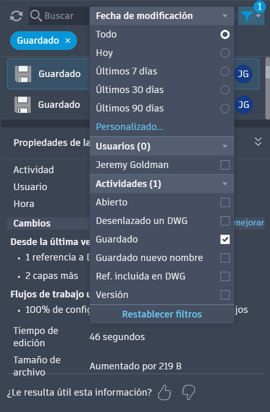 Al seleccionar Guardado en el filtro Actividades, puede aislar la actividad de versión. Para filtrar más, utilice los filtros Hora y Usuarios.