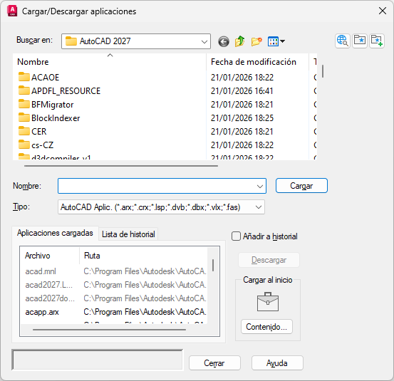 Si selecciona un archivo que ya está cargado, la aplicación se cargará de nuevo cuando proceda. No es posible volver a cargar aplicaciones ObjectARX. En este caso, primero debe descargar la aplicación ObjectARX y después debe cargarla de nuevo. También se puede acceder a la opción Cargar desde un menú contextual que se abre haciendo clic con el botón derecho, colocando el cursor sobre la ficha Lista de historial.