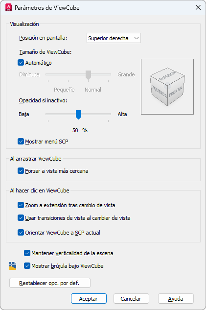 - Mostrar el cuadro de diálogo Parámetros de Viewcube.
