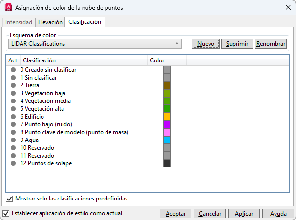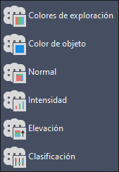 Nota: Para Intensidad, Elevación y Clasificación, la aplicación de estilo se basa en los esquemas de color asignados en el cuadro de diálogo Asignación de color de la nube de puntos (comando ASIGNCOLORNUBEPUNTOS). Si los datos necesarios no existen en la nube de puntos, la opción aparece atenuada en el menú desplegable Aplicación de estilo.