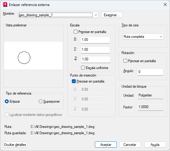 Muestra la ruta que se guarda con el dibujo al enlazar la referencia externa. La ruta depende del parámetro Tipo de ruta.