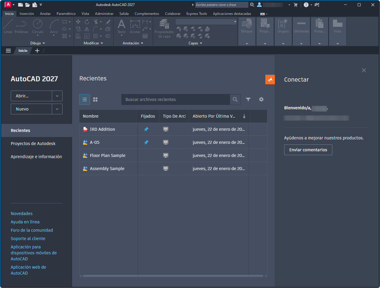La ficha Inicio se muestra por defecto al inicio y proporciona acceso fácil a una amplia variedad de acciones iniciales, incluido el acceso a los archivos de plantilla de dibujo, los dibujos y los conjuntos de planos abiertos recientemente, las opciones en línea y de aprendizaje, y los anuncios.