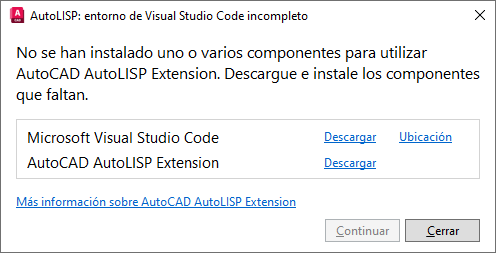 Si Visual Studio Code está instalado, pero no AutoCAD AutoLISP Extension, AutoCAD descarga e instala esta extensión antes de iniciar Visual Studio Code.
