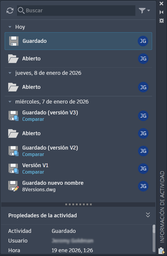 Utilice la herramienta Información de actividad para ver las aportaciones de sus compañeros de equipo a los archivos de dibujo compartidos, comparar historiales de versiones y colaborar en los productos de AutoCAD.