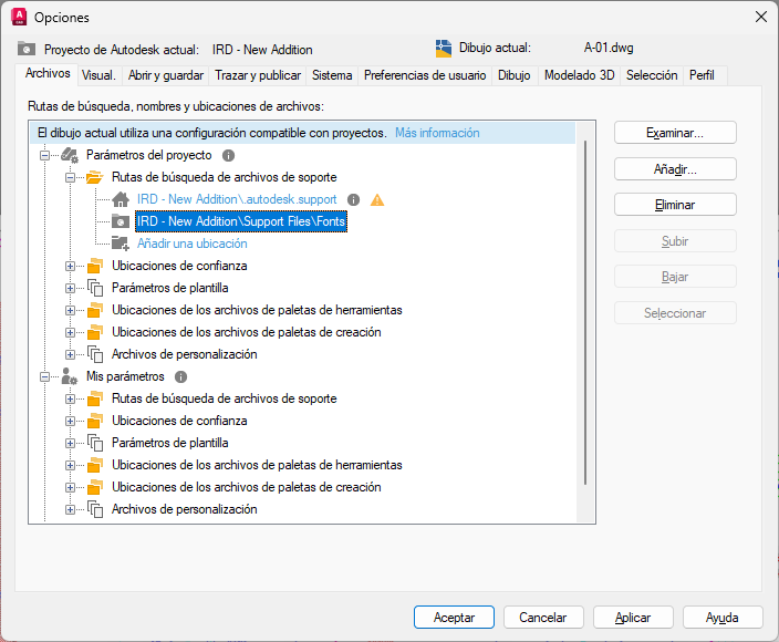 Una vez configurado un proyecto deForma Data Management para utilizar archivos de soporte conectados, puede establecer o cambiar las rutas de estos parámetros. Las rutas se buscan en el orden en que aparecen en la lista. Si se encuentra el mismo archivo en varias carpetas, se utilizará el primer ejemplar encontrado. La configuración de Parámetros del proyecto tiene prioridad sobre Mis parámetros y, a su vez, sobre Parámetros de AutoCAD clásico.