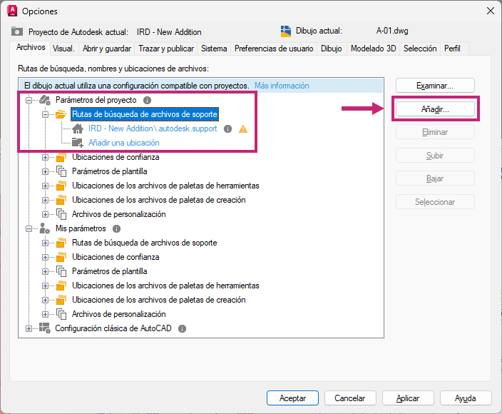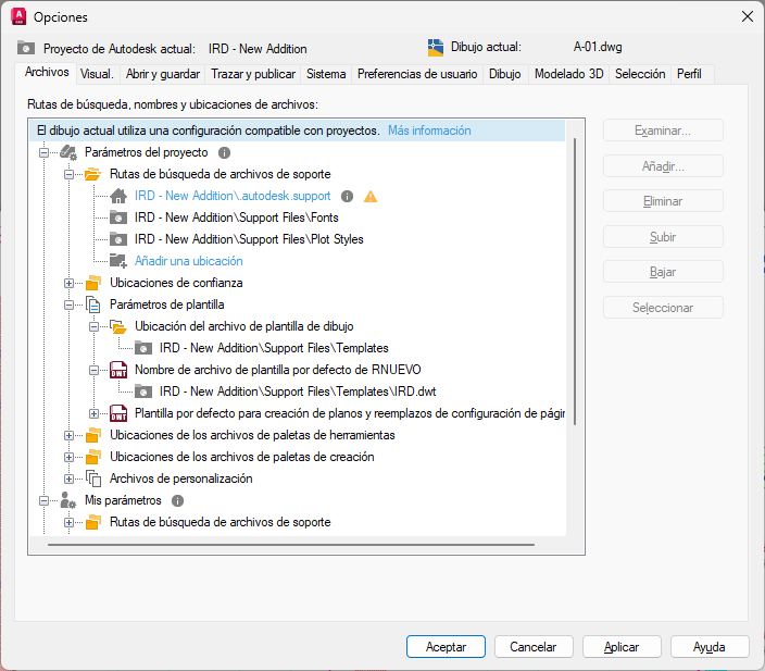- También puede modificar la configuración de la ruta en los nodos Mis parámetros y Parámetros de AutoCAD clásico.