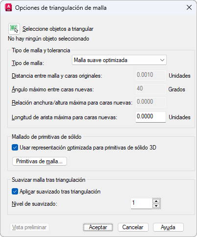 Especifica los parámetros que se utilizarán al convertir objetos de primitiva de sólido 3D en objetos de malla.
