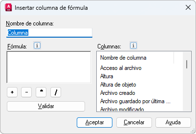 Muestra los nombres de columna de los datos de dibujo extraídos y los datos externos (si se estableció la vinculación de datos). Puede hacer doble clic en los nombres de columna para añadirlos al campo Fórmula o arrastrarlos a éste desde la lista Columna. Las columnas de fórmula existentes no se muestran y no se pueden utilizar como valores para crear columnas de fórmula adicionales.