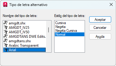 Si no se especifica un tipo de letra alternativo, cuando se abre un dibujo con tipos de letra que no se pueden encontrar, aparece un cuadro de diálogo que permite especificar el tipo de letra que se debe usar para cada tipo de letra no encontrado.