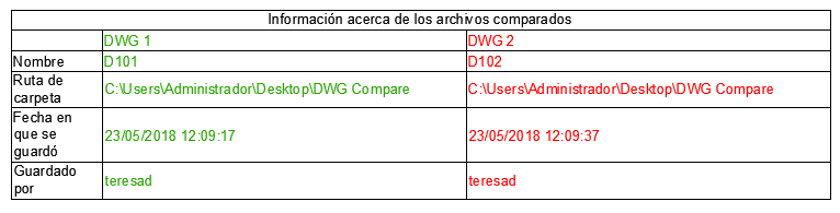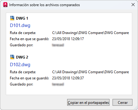 Este comando abre un cuadro de diálogo que muestra información sobre dos archivos de dibujo comparados. Hay opciones disponibles para crear un objeto de tabla con la información o para copiarla en el portapapeles.