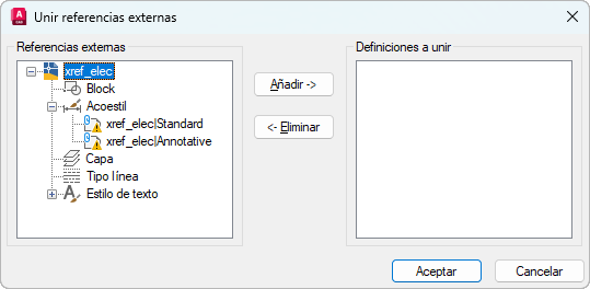Fusiona en el dibujo actual objetos guardados dependientes de referencias externas (como bloques, estilos de cota, capas, tipos de línea y estilos de texto).
