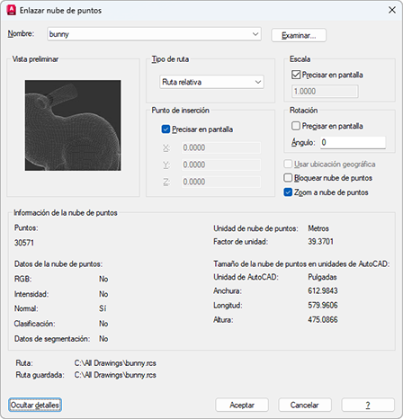 Cómo enlazar un proyecto de nube de puntos o archivo de exploración a un dibujo para trabajar con él.