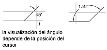El programa determina el ángulo utilizando las líneas como vectores del ángulo y su intersección como vértice del ángulo. La línea de cota abarca el ángulo entre las dos líneas. Si la línea de cota no interseca las líneas que se están acotando, se añadirán líneas de referencia para alargar una o ambas líneas, según sea necesario. El arco siempre es de menos de 180 grados.