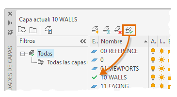 Todos los objetos nuevos se dibujan por defecto en la capa actual. La marca de verificación de color verde en el Administrador de propiedades de capa indica la capa actual.