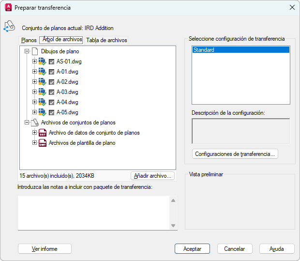Muestra los datos del informe que se incluyen en el paquete de transferencia. En esta información se incorpora cualquier nota de transferencia introducida y las notas de distribución generadas de forma automática, que detallan los pasos que se deben seguir para que el paquete de transferencia funcione correctamente. Por ejemplo, si se detectan tipos de letra SHX en uno de los dibujos transferidos, se le indicará dónde debe copiar estos archivos para que se puedan detectar en el sistema en el que se instalará el paquete de transferencia. Si se crea un archivo de texto con las notas por defecto, las notas también se incluyen en el informe.