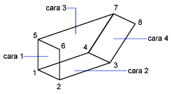 En la ilustración, la cara 1 está definida por los vértices 1, 5, 6 y 2. La cara 2 está definida por los vértices 1, 4, 3 y 2. La cara 3 está definida por los vértices 1, 4, 7 y 5 y la cara 4 por los vértices 3, 4, 7 y 8.