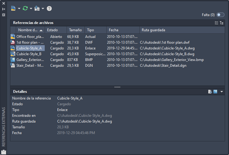 La columna de nombre de la referencia muestra siempre el dibujo actual como la primera entrada, seguido de archivos enlazados adicionales presentados en el orden en que se enlazaron.