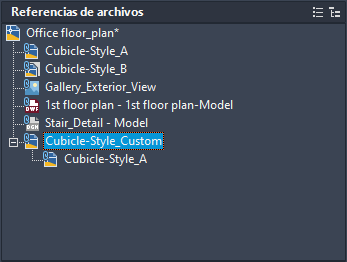 En el nivel superior de la vista en árbol se muestra siempre el dibujo actual. Los archivos de referencia aparecen en el siguiente nivel. Los archivos de referencia que contienen sus propias referencias de archivo anidadas pueden abrirse para mostrar niveles más profundos. Cuando se realizan selecciones en la vista en árbol, las referencias de archivo solo se pueden seleccionar de una en una.
