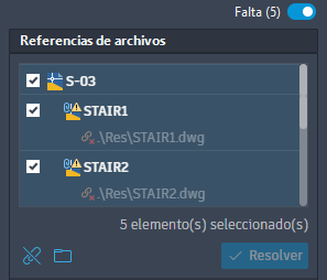 Alterna entre los estados Mostrar todas las referencias enlazadas y Mostrar solo las referencias que faltan. Si está activada la opción Mostrar solo las referencias que faltan, puede utilizar el flujo de trabajo Referencias conectadas para actualizar las rutas de las referencias de dibujo externas que faltan (refX). Para ello, especifique manualmente una nueva ruta para las referencias o acepte una ruta sugerida para las referencias en el dibujo actual cuando se abra desde un proyecto de Autodesk en Forma Data Management.