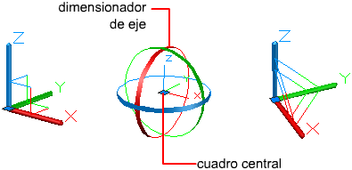 Por defecto, el gizmo se sitúa inicialmente en el centro del conjunto de selección. No obstante, puede reubicarlo en cualquier posición del espacio 3D. El cuadro central (o pinzamiento base) del gizmo establece el punto base para la modificación. Este comportamiento equivale a cambiar temporalmente la posición del SCP mientras desplaza o gira los objetos designados. Los dimensionadores del eje del gizmo restringen el desplazamiento o el giro a un eje o un plano.