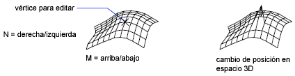 Edita vértices individuales de una malla poligonal que se puede ver como una matriz M por N rectangular, donde M y N son las cotas especificadas en 3DMALLA. Las variables SURFTAB1 y SURFTAB2 almacenan los valores de M y N para SUPREGLA, SUPTAB, SUPREV y SUPLADOS.