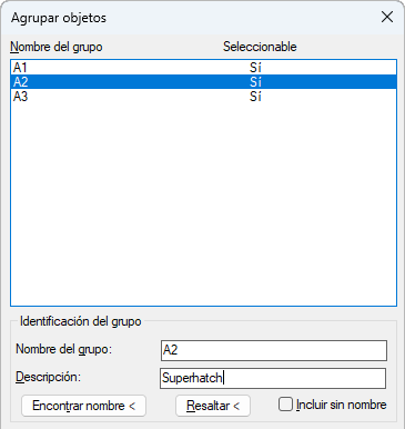 3) Seleccione el grupo. Observe que "superhatch" aparece en el campo de descripción de los grupos creados por SUPERHATCH.