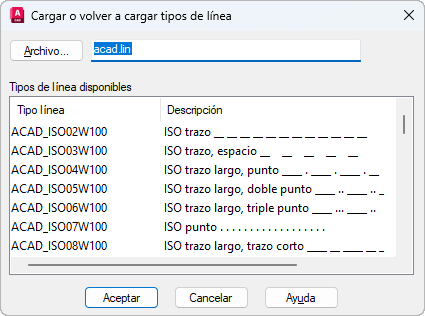 Muestra el cuadro de diálogo Seleccionar archivo de tipo de línea, en el que puede seleccionar un archivo de tipo de línea (LIN) diferente.