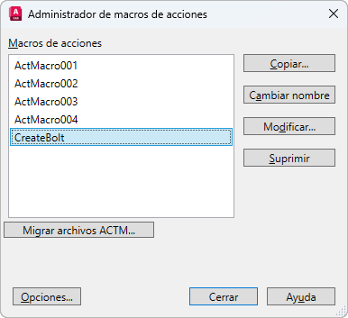 Los archivos de macros de acciones que se hayan grabado (ACTMX) aparecerán enumerados en el Administrador de macros de acciones.