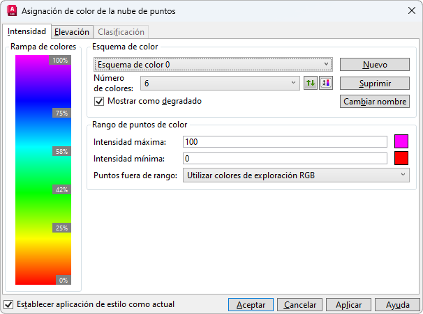 Permite editar los parámetros de esquema de color de la aplicación de estilo Intensidad de la nube de puntos.