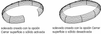 Cierra y abre una superficie o sólido. Al utilizar esta opción, las secciones transversales deberían formar un patrón con forma de toroide de manera que la superficie o el sólido solevados puedan formar una sección cerrada. (Variable de sistema LOFTPARAM)