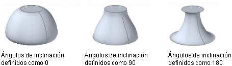 Controla el ángulo de inclinación y la magnitud de las secciones transversales inicial y final del sólido o la superficie solevados. El ángulo de inclinación es la dirección inicial de la superficie. 0 se considera hacia afuera desde el plano de la curva. (Variable de sistema LOFTNORMALS)