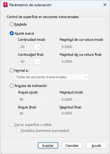 Precisa que el sólido o la superficie son reglados (rectos) entre las secciones transversales y presentan aristas vivas en dichas secciones. (Variable de sistema LOFTNORMALS)