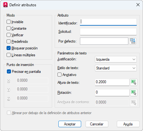 Asigna un valor fijo a los atributos al insertar el bloque. Este parámetro se utiliza para la información que nunca cambia.