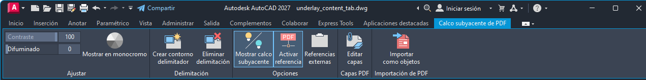 Calco subyacente de PDF (ficha contextual de la cinta de opciones)