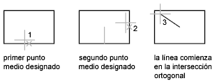 Por ejemplo, se puede utilizar la intersección ortogonal para encontrar el punto central de un rectángulo sin utilizar líneas auxiliares. Inicie la intersección ortogonal y designe el punto medio de una línea horizontal. Arrastre le cursor en vertical y designe el punto medio de una línea vertical (2). Pulse Intro para aceptar el punto (3) en el centro del rectángulo.