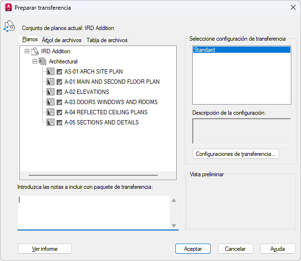 Muestra los datos del informe que se incluyen en el paquete de transferencia. En esta información se incorpora cualquier nota de transferencia introducida y las notas de distribución generadas de forma automática, que detallan los pasos que se deben seguir para que el paquete de transferencia funcione correctamente. Por ejemplo, si se detectan tipos de letra SHX en uno de los dibujos transferidos, se le indicará dónde debe copiar estos archivos para que se puedan detectar en el sistema en el que se instalará el paquete de transferencia. Si se crea un archivo de texto con las notas por defecto, las notas también se incluyen en el informe.