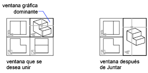 Las dos ventanas modelo deben compartir una arista común con la misma longitud. La ventana gráfica resultante hereda la vista de la ­ventana gráfica dominante.