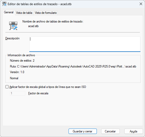 Muestra información acerca de la tabla de estilos de trazado que se está editando: número de estilos de trazado, ruta y versión del Editor de tablas de estilos de trazado.