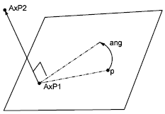 Gira un punto p por el ángulo áng alrededor del eje que pasa por los puntos AxP1 y AxP2, tal y como se muestra en el ejemplo siguiente. El eje está orientado desde el primer punto al segundo.