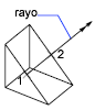 El rayo se extiende hacia el borde de la pantalla en la dirección definida por el punto de inicio y el punto a atravesar. La solicitud de punto a atravesar vuelve a mostrarse para permitir la creación de varios rayos. Pulse Intro para terminar el comando.