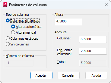 Muestra y especifica valores de control de anchura de columna y de espacio entre columnas. El valor de espacio entre columnas es cinco veces la altura del texto por defecto.