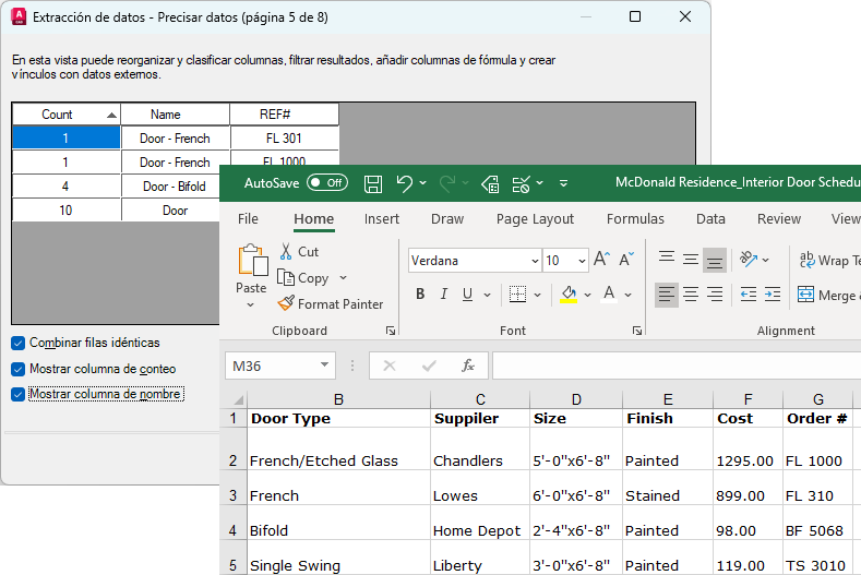La información almacenada en una hoja de cálculo de Excel se puede vincular y combinar con los datos de dibujo extraídos (datos de propiedades del dibujo). Siguiendo con el ejemplo anterior, dispone de cierta información adicional sobre las puertas del dibujo en una hoja de cálculo de Excel (proveedor y coste). Seleccione las columnas de proveedor y coste en la hoja de cálculo y combínelas con otros datos de la extracción de datos.