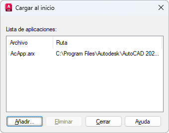Muestra una lista ordenada alfabéticamente (por nombre de archivo) de los archivos de aplicaciones que se van a cargar al iniciar.